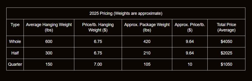 Our 2025 pricing is below. Because each animal weighs differently, the costs are approximate. Because of inflation and rising costs in processing we have had to increase pricess. The good news is you'll still be receiving the same great product. All yearling calves are ultra sounded for tenderness, shape of the rib-eye area and percentage of intramuscular fat - and we only select those that pass our strict criteria. We continue to upgrade the genetics and quality of our animals.